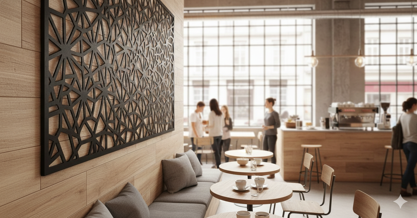 Divisores de ambiente: paneles metálicos cortados a láser que combinan arte y privacidad, ideales para interiores modernos o áreas comerciales.